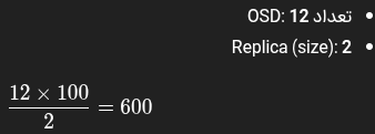 نکته : در محاسبه و تعیین عدد PG تنها به فرمول نباید اتکا کرد. به عنوان مثال در سناریو اشاره شده در بالا ، پیشنهاد میشود عدد PG برابر با 128 بوده اما قابلیت autoscale فعال باشد تا در صورت نیاز این عدد افزایش یابد.