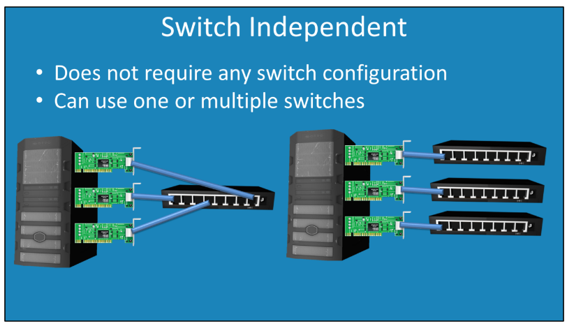- در این حالت هر یک از کارتهای شبکه میتواند به یک سویچ مجزا متصل شود که در این حالت سوئیچ هیچ اطلاعاتی از Team بودن کارتهای شبکه ندارد. اگر سلامت سوئیج و دسترس پذیری آن برای شما مسئله است ، میتوانید از این حالت استفاده نموده و هر کارت را به یک درگاه از یک سوئیچ متصل نمایید.