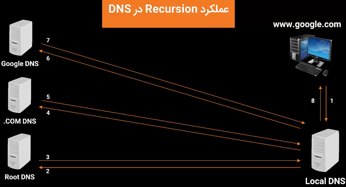Recursion فرآیند جستجوی کامل و قدم به قدم توسط سرور DNS برای یافتن پاسخ درخواستی کاربر است، در صورتی که پاسخ در حافظه موقت (Cache) موجود نباشد.