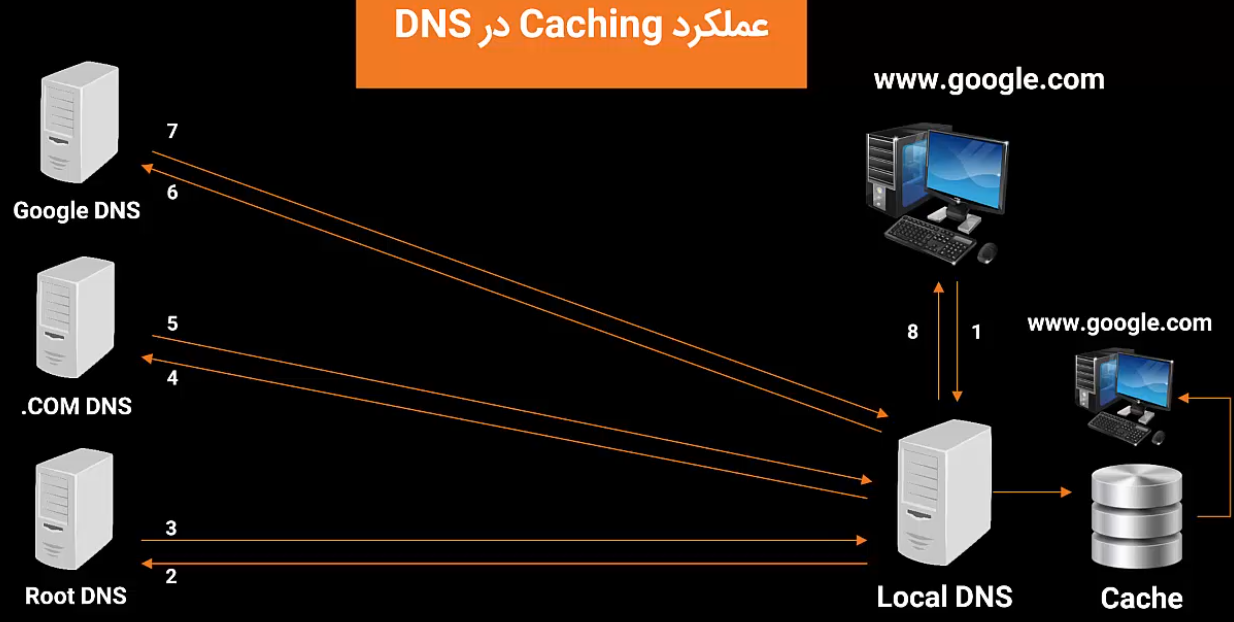 - سرور DNS پاسخ را در کش ذخیره میکند و به کلاینت میدهد.