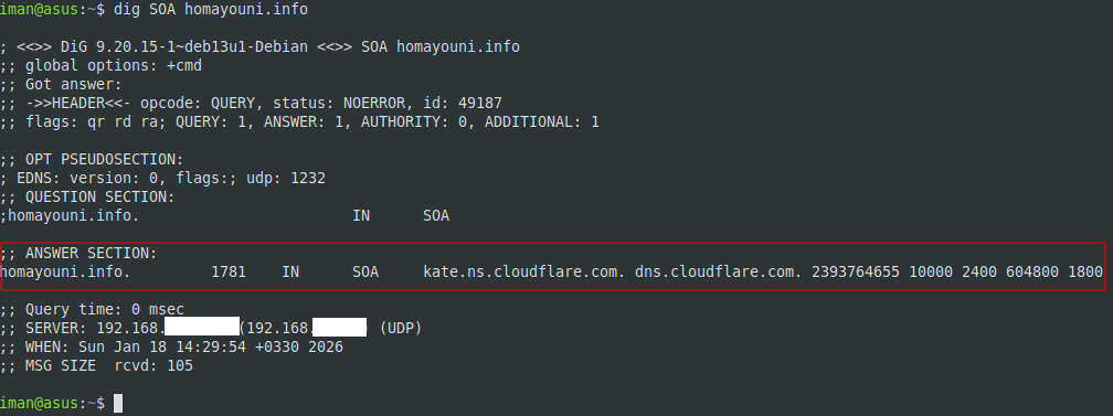 نکته : به خط نارنجی رنگ در تصویر بالا اصطلاحا یک RR یا Resource Record گفته میشود. (تصویر بالا شامل دو RR به صورت SOA و NS است.)