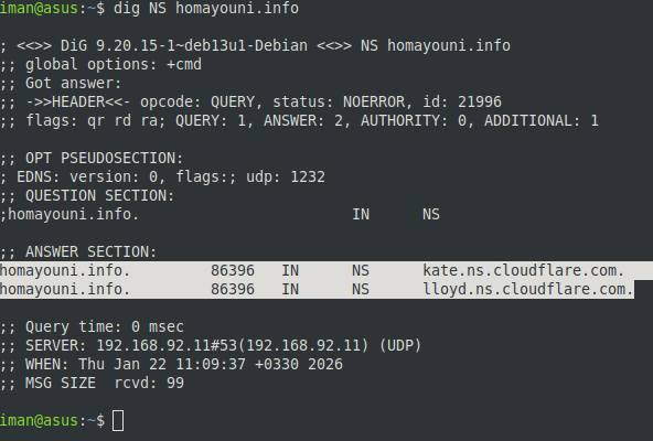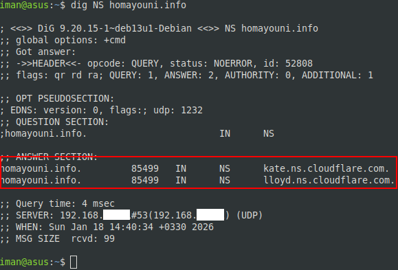 مطابق با تصویر بالا ، سرورهای NS برای دامنهی homayouni.info دو عدد بوده که مربوط به سرورهای CloudFlare است. در واقع دادههای فنی بیشتر و تکمیلی مربوط به دامنهی homayouni.info و تمامی Sub Domain های آن درون NS سرورهای CloudFlare قرار گرفته است.