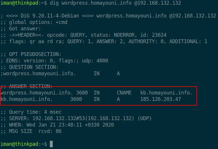 به عنوان مثال برای دامنهی kb.homayouni.info یک CNAME با نام wordpress.homayouni.info درون DNS Server ایجاد شده است. خروجی دستور dig در این شرایط به صورت زیر خواهد بود.