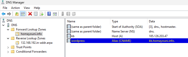 نمونهای از CNAME Record در Microsoft DNS Server به صورت زیر است.