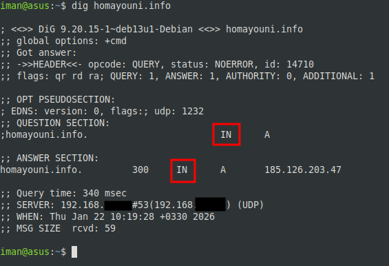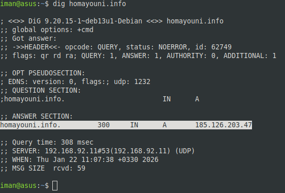 به عنوان مثال خروجی دستور dig برای دامنهی homayouni.info را مشاهده نمایید.