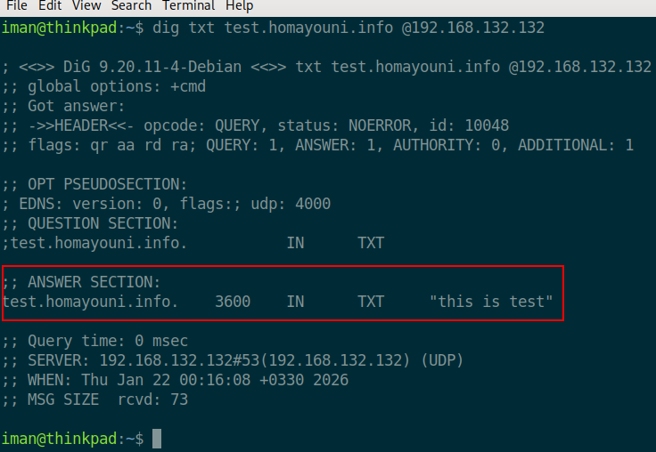 خروجی ابزار dig برای بررسی بیشتر رکورد TXT روی دامنهی test.homayouni.info به شرح زیر است.