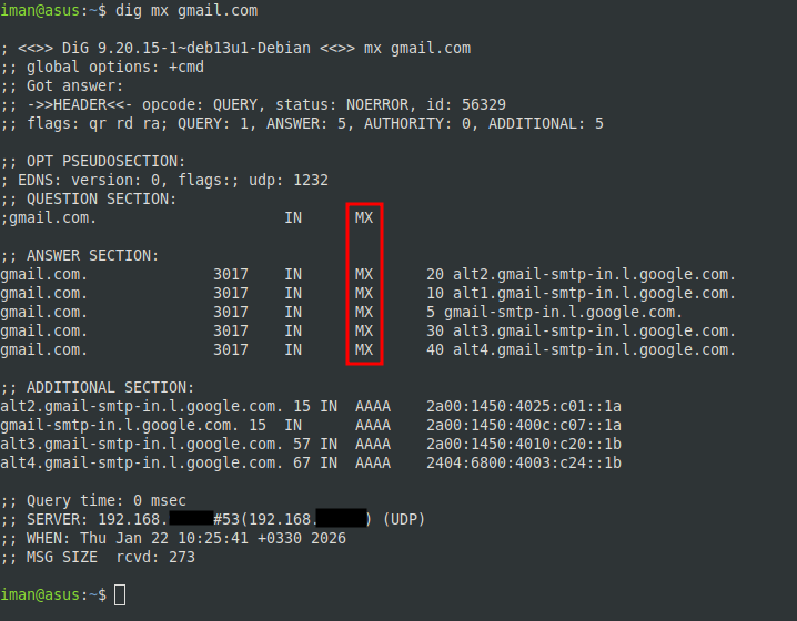 به عنوان نمونه در دستور dig در تصویر زیر نسبت به ارسال درخواست DNS از جنس یا Type رکورد MX اقدام شده است.